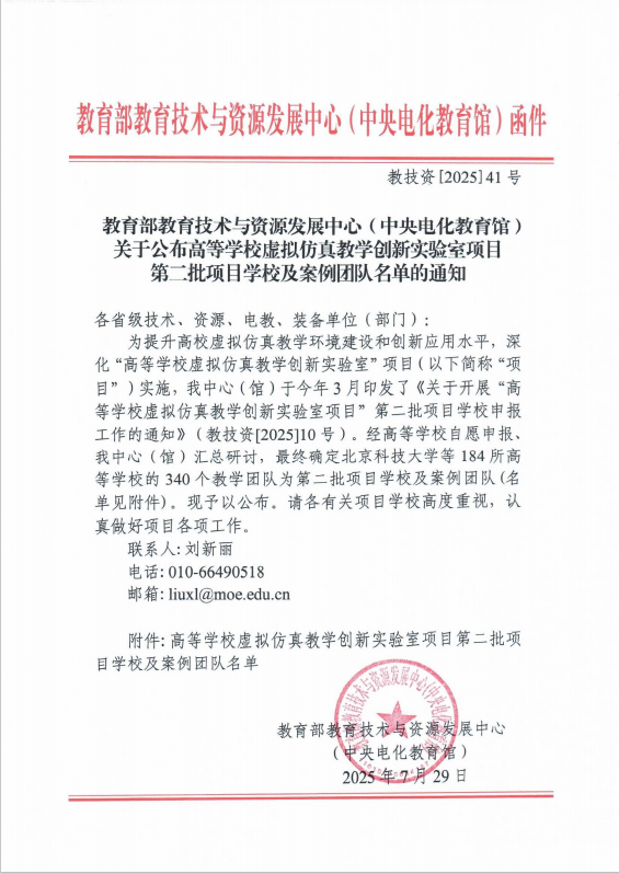 近日,教育部教育技术与资源发展中心(中央电化教育馆)印发《关于公布高等学校虚拟仿真教学创新实验室项目第二批项目学校及案例团队名单的通知》(教技资〔2025〕41号),管家婆六合彩(中国)官方网站