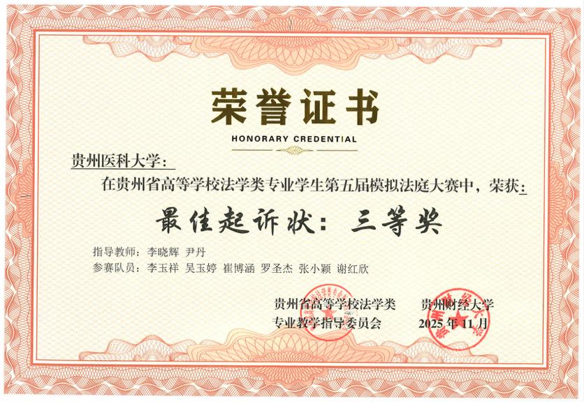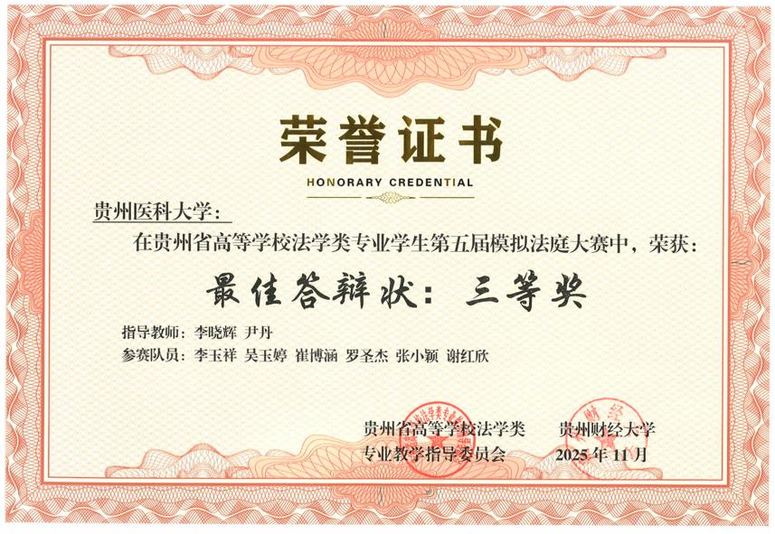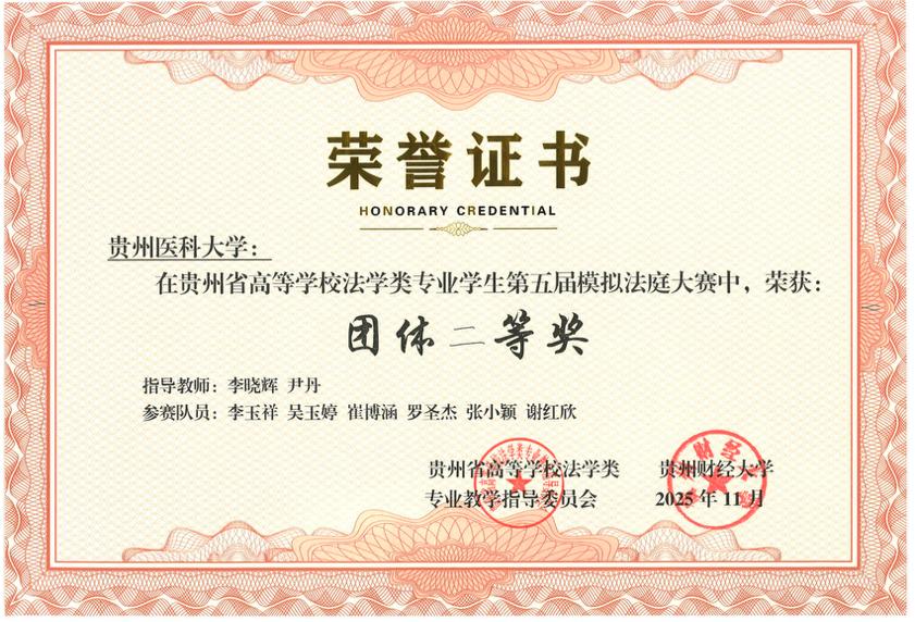 2025年11月22日,贵州省高等学校法学类专业学生第五届模拟法庭大赛在贵州财经大学圆满落幕。我校管家婆六合彩(中国)官方网站