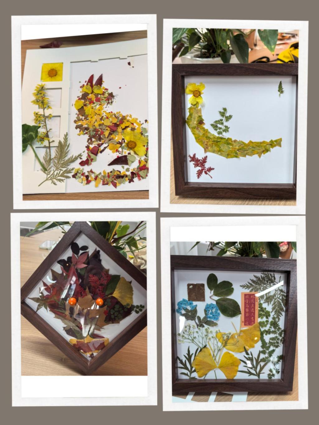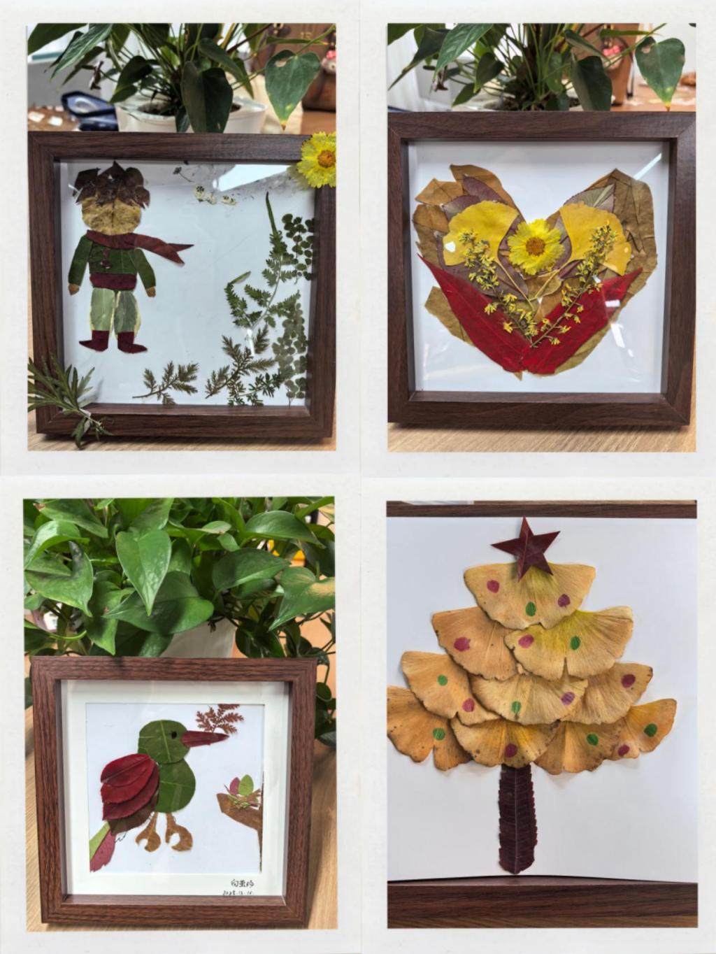 活动中,学生以深秋时节的落叶为自然笔触,将叶片的形态肌理与斑斓色彩化作创意语言:深浅交织的叶片拼缀成中国地图,在自然纹理中藏纳家国情怀;经巧手塑形的叶片还原《小王子》的经典场景,借叶脉纹路勾勒故事的温柔意境;灵动的碎叶组合成振翅欲飞的小鸟,薄透叶片层层叠叠晕染出蝴蝶的斑斓羽翼,细长三角叶则精准拼出蜻蜓的轻盈身姿;更有金黄银杏叶铺展成灵动“生命树”,以扇形叶瓣的独特弧度诠释生命的蓬勃意象,每一幅作品都让自然之美与人文哲思在方寸相框中悄然交融。据活动后问卷反馈,参与学生对活动满意度高达93.75%,纷纷表示“此类活动非常有趣且富有深意;在艺术创作中释放压力,感到身心愉悦;希望参加更多类似的手工减压活动。”