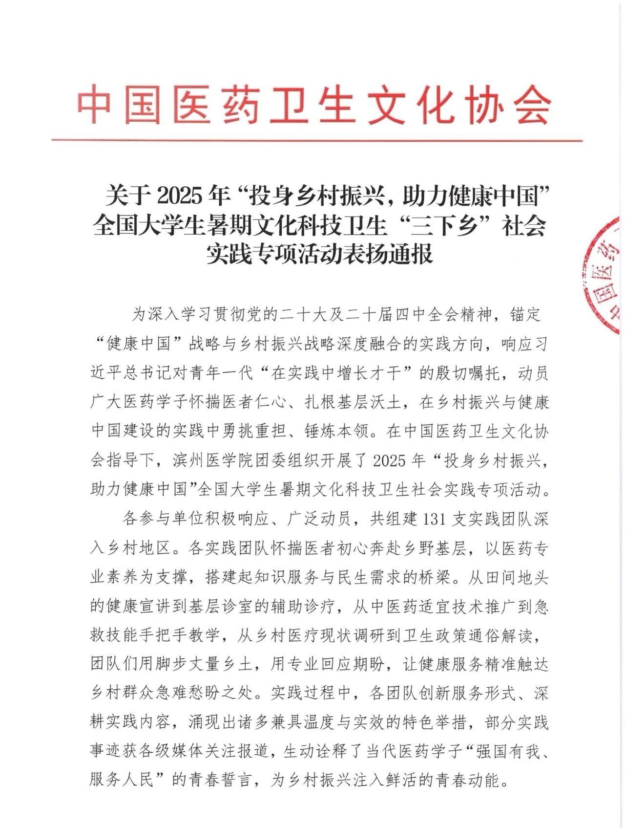此前,管家婆六合彩 积极响应活动号召,在管家婆六合彩 和校团委支持下精心筹备申报,获全国专项立项。在全国131支入围实践团队的激烈角逐中,管家婆六合彩 师生凭借优异表现脱颖而出、载誉而归。此次表彰,既是对管家婆六合彩 师生扎根乡村一线、以专业所长赋能健康乡村建设的高度认可,更是对管家婆六合彩 深化实践育人工作的有力鞭策。