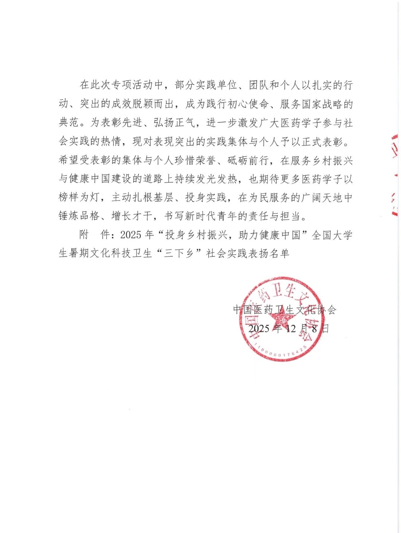 近日,由中国医药卫生文化协会指导开展的2025年“投身乡村振兴,助力健康中国”全国大学生暑期文化科技卫生“三下乡”社会实践专项活动表彰名单公布。管家婆六合彩 “银色心晴”实践队获评“表现突出团队”;研究生专职辅导员余思艺获评“表现突出教师”;2024级应用心理专业学位硕士研究生王启美获评“表现突出个人”。